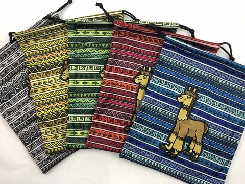 A set ofĀ five, microfiber drawstring bagsĀ for use with the game Altiplano. Each bag measuresĀ 17x20cm andĀ is used as drawbags to replace the black fabric ones found in the box. Each bag features the llama from the cover of the Altiplano game box and isĀ tinted to each player color.