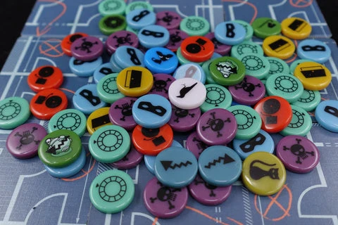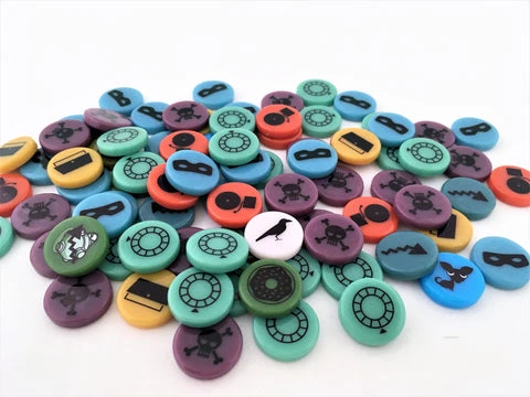 One set of GeekUp tokens for Burgle Bros includes 84 tiles, all 20mm opaque circles that are 4mm deep: