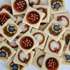 The pieces are made of a hard plastic, similar to bakelite, and the graphics are applied via a 4 color heat transfer process, which fuses the images to the plastic in a way that makes them very scratch resistant, meaning they should last a lifetime.