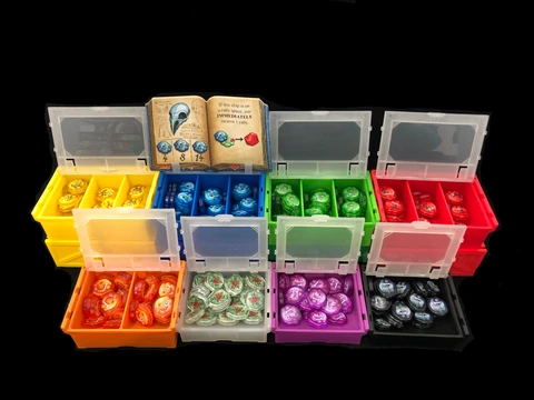 Already love the GeekUp bits for Quacks? Maybe you are looking for a new way to display the ingredient books? Then organize your game to perfection with this storage box set for Quacks of Quedlinburg! Designed to store the purchasable ingredients for both the base game and the Herb Witches expansions, this eight-box set is color-coded for each ingredient, with a built-in book stand in the attached cover. And as an added bonus, EVERYTHING FITS IN THE ORIGINAL BOX! This storage set was designed to fit in the base box, including both the Herb Witches and Alchemist expansions.
