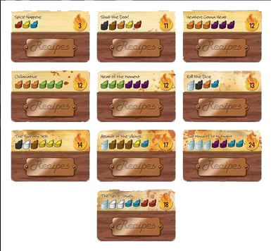 These cards are added to the recipe cards in the base game for extra variety and chosen at random per the usual rules.