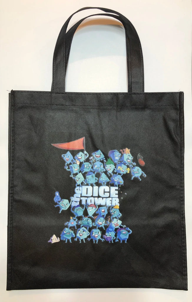 Dice Tower game tote to carry your games around! This black, reusable bag shows a fun spin on the Dice Tower logo on one side and is 38x34x25cm.